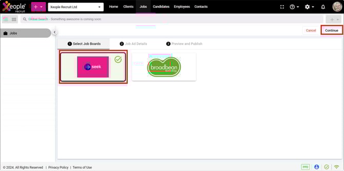 - Once you enable the toggle button, it will redirect you to the Job Boards page where you can select SEEK to post a job.