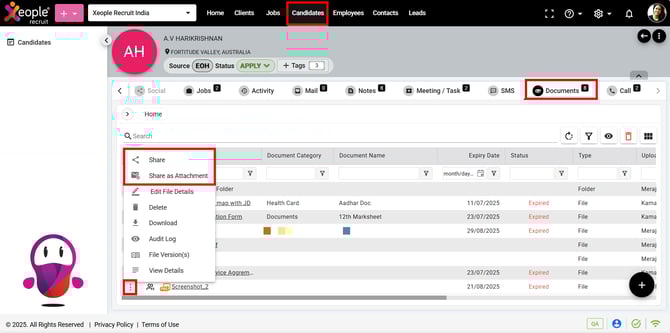 - This action will take you to the candidate summary page. Navigate to the Document section and click the three-dot button next to each document.