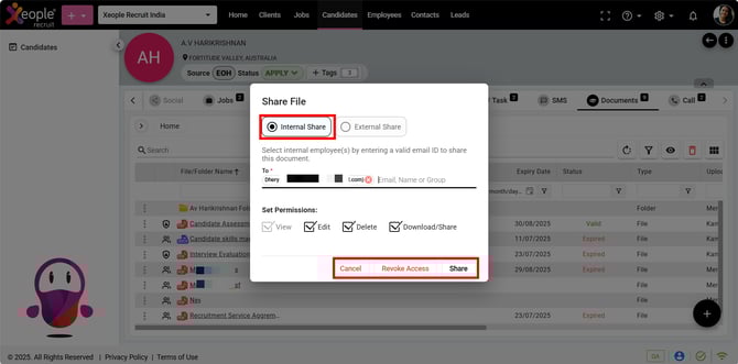 - Once a file is shared internally, a Revoke Access button appears after sharing. Clicking Revoke opens a pop-up to remove access.