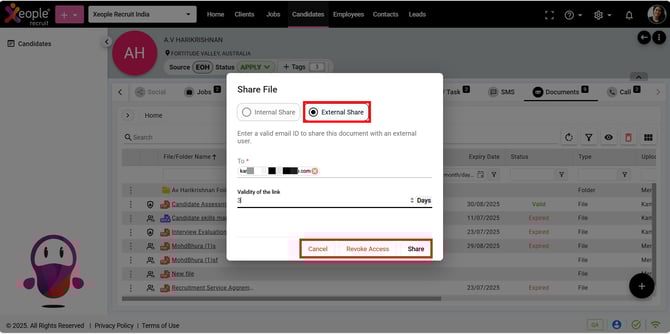 - Upon clicking Share, click on the external share toggle. Enter the recipient's email address and choose the link validity period and customise your file permissions as needed.