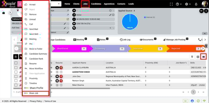 If you manually select a hired candidate using the checkbox placed in front of the candidate’s name and then click the three-dot menu, the Share Job option will appear disabled.