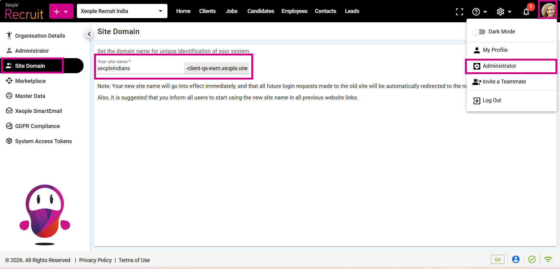 At the time of tenant creation, the configured site URL becomes the default domain for the system. You can update the site domain later from the Site Domain settings. Once updated, the new domain takes effect immediately, and all login requests from the old URL are automatically redirected to the new one.
