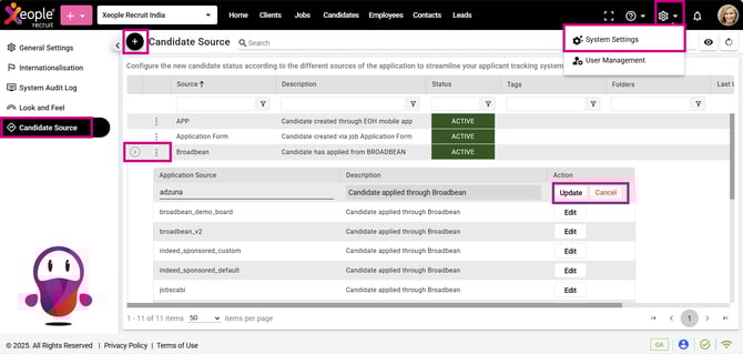 Candidate/application source refers to the origin where candidate applications are received, such as Application Forms, Broadbean, SEEK, EOH, Xeople SmartEmail, etc. This feature allows you to add, edit, or delete custom sources based on your needs. However, for sources created by others, you can only edit them, not delete. This customisation ensures tailored management of candidate data. Additionally, child sources linked to parent sources can be modified, providing flexibility to align sources with specific recruitment requirements.