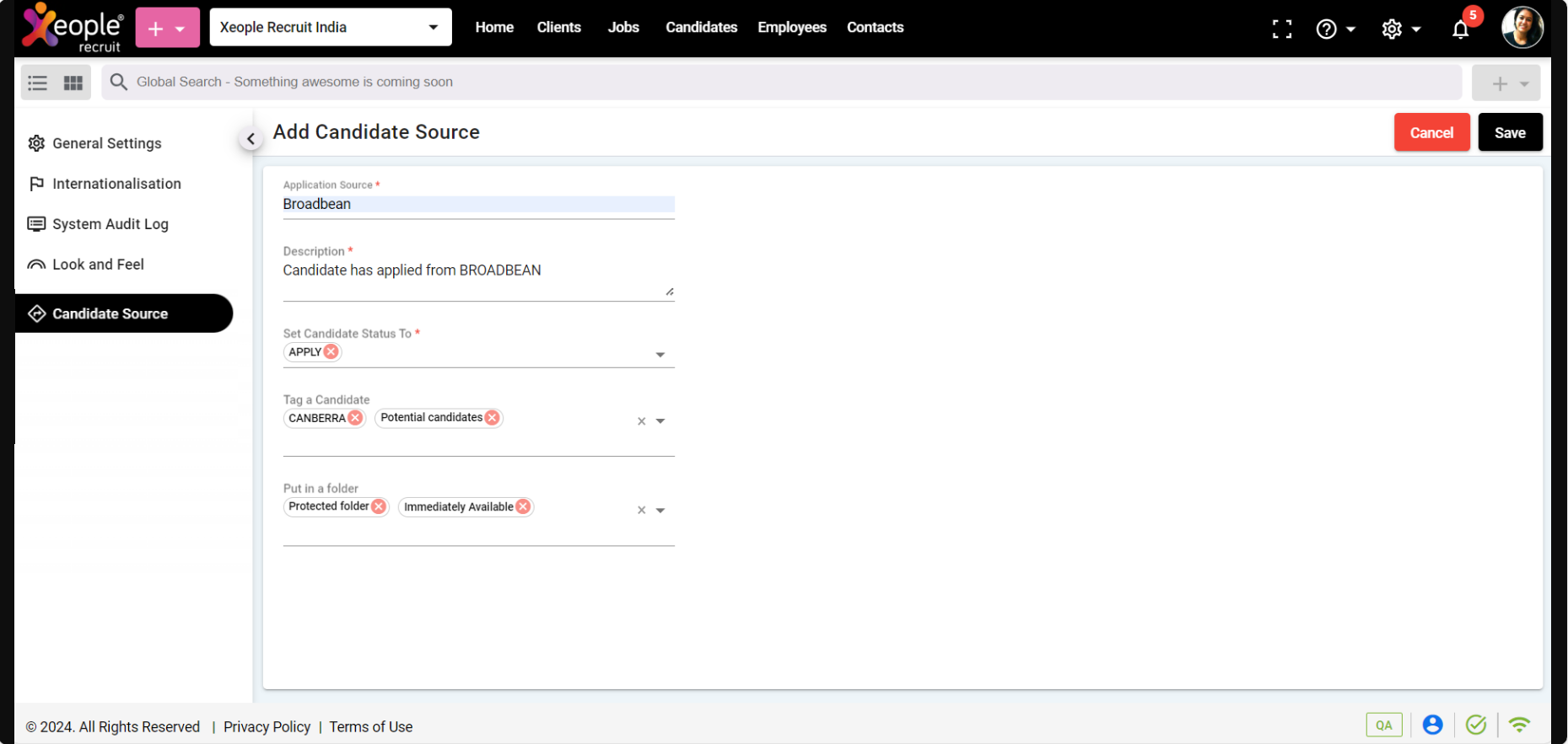 - Click on (+) Add Candidate source this will allow you to add source name, description, status, tag and folder.