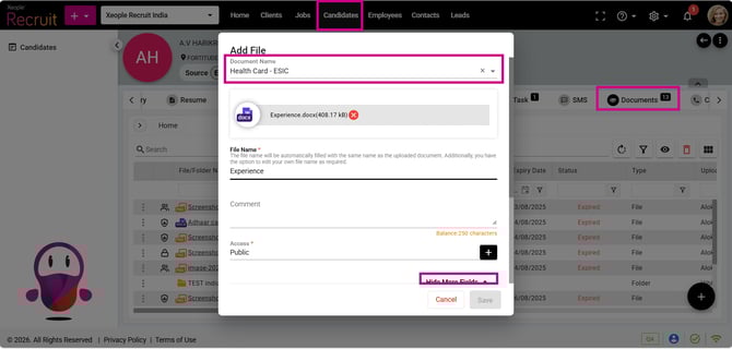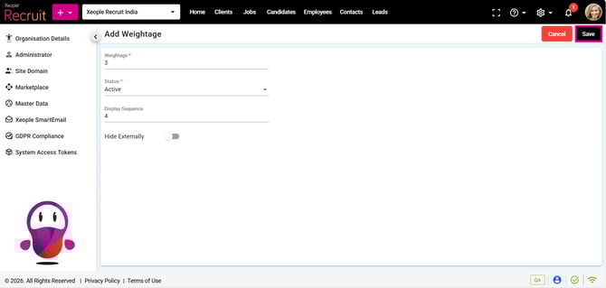 - You can assign the newly created weightage while configuring the Document Name Master. This weightage applies to documents added across all modules, including Clients, Jobs, Candidates, Employees, and Leads.